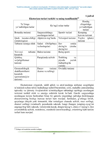 asoslangan turizm faoliyatlari bilan bir qatorda yuqoridagi jadvalga kiritilmagan
