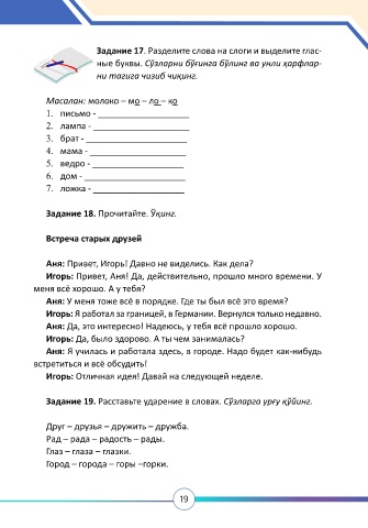 Задание 19. Расставьте ударение в словах. Сўзларга урғу қўйинг.