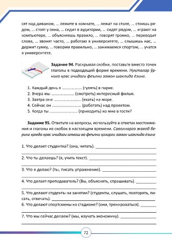 ния и глаголы из скобок в настоящем времени. Саволларга жавоб бе-
