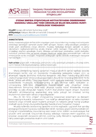Kalit so‘zlar: g‘ijjak sinfi, motivatsiya, yosh ijrochi, ruhiy-psixologik yondashuv, musiqiy ta’lim,