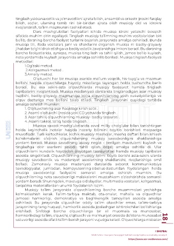 barcha faoliyatlarida, ayniqsa, musiqa ting lash va tahlil qilish, jamoa bo‘lib kuylash,