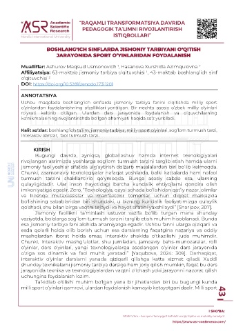 Kalit so‘zlar: boshlang‘ich ta’lim, jismoniy tarbiya, milliy sport o‘yinlari, sog‘lom turmush tarzi,
