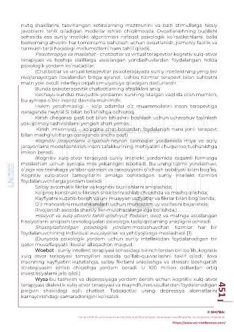 (Chatbotlar va virtual terapevtlar psixoterapiyada sunʼiy intellektning yeng tez