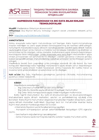 Kalit soʻzlar: Big Data, MapReduce paradigmasi, gorizontal oʻlchovlar, maʼlumotlarning