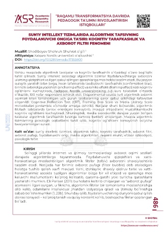 Kalit soʻzlar: sun’iy intellekt tizimlari, algoritmik tafsiv, kognitiv tarafkashlik, axborot filtri,