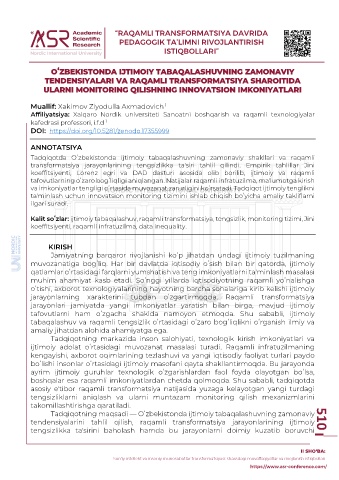 Kalit soʻzlar: ijtimoiy tabaqalashuv, raqamli transformatsiya, tengsizlik, monitoring tizimi, Jini