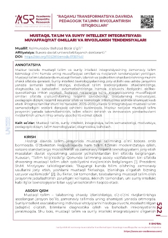 Kalit soʻzlar: Mustaqil taʼlim, sunʼiy intellekt, integratsiya, taʼlim samaradorligi, motivatsiya,