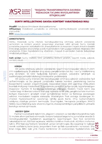 Kalit soʻzlar: Sun’iy intellekt, OAV, jurnalistika, kontent yaratish, raqamli media, axborot,