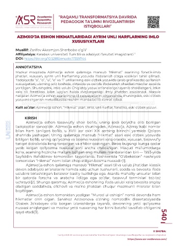 Kalit soʻzlar: Azimxo‘ja eshon, “Hikmat” asari, imlo, unli harflar, fonetika, eski o‘zbek yozuvi.