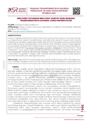 va amaliy jihatlari raqamli transformatsiya sharoitida tahlil qilinadi. Inklyuziv ta’lim barcha