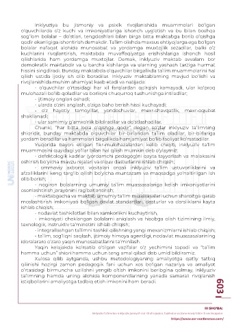 qilish ustida ijodiy ish olib boradilar. Inklyuziv maktablarning mavjud bo‘lishi va