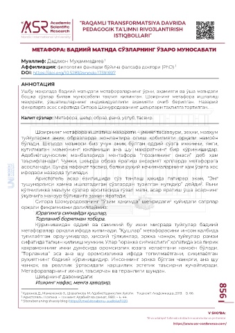 Ушбу мақолада бадиий матндаги метафораларнинг ўрни, аҳамияти ва ўша матндаги