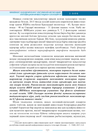 Page 121 - ИНВЕСТИЦИОН ЖОЗИБАДОРЛИКНИНГ НАЗАРИЙ, МЕТОДОЛОГИК ВА АМАЛИЙ ТАЛҚИНИ