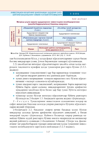 Page 147 - ИНВЕСТИЦИОН ЖОЗИБАДОРЛИКНИНГ НАЗАРИЙ, МЕТОДОЛОГИК ВА АМАЛИЙ ТАЛҚИНИ