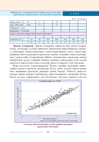 панел бирлиги бўйича ўзгарувчиларнинг йилма-йил тўпланганлигидан 4.4.1-расм. Инвестициялар ва ялпи ҳудудий маҳсулот