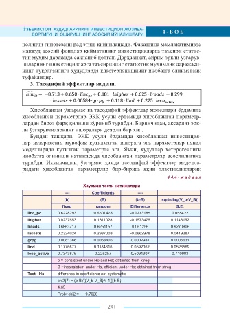 Ушбу муаммо кейинги ҳисобланган ўзгармас ҳамда тасодифий эффектлар fixed random Difference S.E.