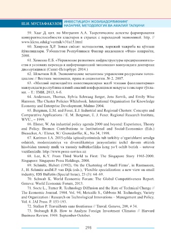 65. Bergman, E.M. and Feser, E.J. Industrial and Regional Clusters: Concepts and 83. Доклад о мировых инвестициях за 2015 г. конференция организации