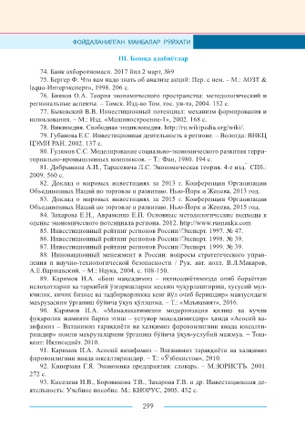 67. Karimov I.A. 2015-yilda iqtisodiyotimizda tub tarkibiy o‘zgarishlarni amalga 87. инвестиционный рейтинг регионов России//Эксперт. 1999. № 39.