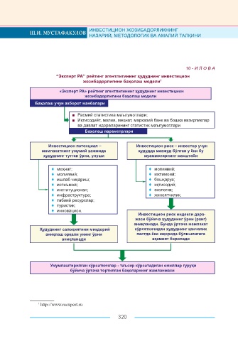 Page 320 - ИНВЕСТИЦИОН ЖОЗИБАДОРЛИКНИНГ НАЗАРИЙ, МЕТОДОЛОГИК ВА АМАЛИЙ ТАЛҚИНИ