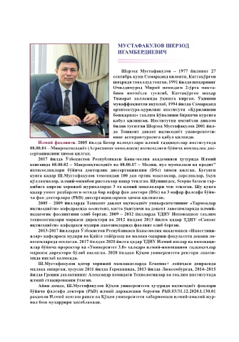 ихтисосликлари бўйича докторлик диссертациясини (DSc) ҳимоя қилган. Бугунги