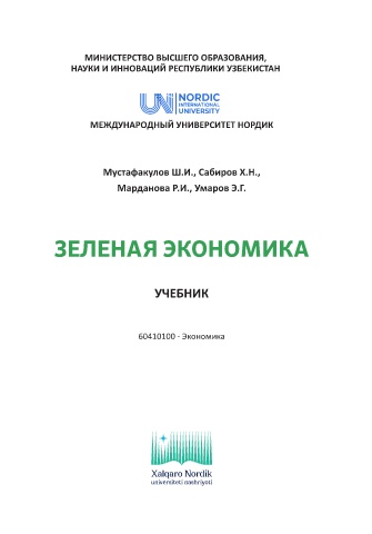 МИНИСТЕРСТВО ВЫСШЕГО ОБРАЗОВАНИЯ, НАУКИ И ИННОВАЦИЙ РЕСПУБЛИКИ УЗБЕКИСТАН МEЖДУНАРOДНЫЙ УНИВEРСИТEТ НOРДИК Мустафакулов Ш.И., Сабиров Х.Н., Марданова Р.И., Умаров Э.Г. ЗЕЛЕНАЯ ЭКОНОМИКА УЧЕБНИК 60410100 - Экономика