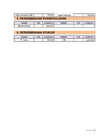 Setijo Darmanto 0698 75,000 Japaet Sidabutar 400,000 4. PERSEMBAHAN PERSEPULUHAN NAMA VIA JUMLAH NAMA VIA JUMLAH Mikhael Adinata 650,000 - - 5. PERSEMBAHAN SYUKUR NAMA VIA JUMLAH NAMA VIA JUMLAH PT. Lelco 150,000 NN 6,220,000 Halaman 12