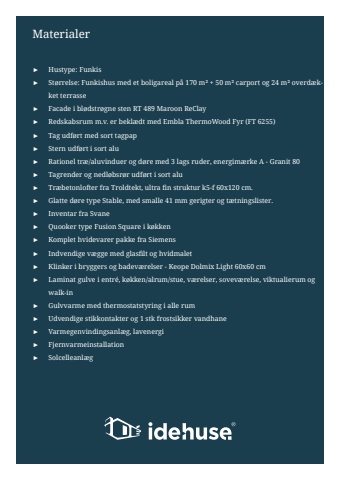 %u25ba Hustype: Funkis%u25ba St%u00f8rrelse: Funkishus med et boligareal p%u00e5 170 m%u00b2 + 50 m%u00b2 carport og 24 m%u00b2 overd%u00e6kket terrasse%u25ba Facade i bl%u00f8dstr%u00f8gne sten RT 489 Maroon ReClay%u25ba Redskabsrum m.v. er bekl%u00e6dt med Embla ThermoWood Fyr (FT 6255)%u25ba Tag udf%u00f8rt med sort tagpap%u25ba Stern udf%u00f8rt i sort alu%u25ba Rationel tr%u00e6/aluvinduer og d%u00f8re med 3 lags ruder, energim%u00e6rke A - Granit 80%u25ba Tagrender og nedl%u00f8bsr%u00f8r udf%u00f8rt i sort alu%u25ba Tr%u00e6betonlofter fra Troldtekt, ultra fin struktur k5-f 60x120 cm.%u25ba Glatte d%u00f8re type Stable, med smalle 41 mm gerigter og t%u00e6tningslister.%u25ba Inventar fra Svane%u25ba Quooker type Fusion Square i k%u00f8kken%u25ba Komplet hvidevarer pakke fra Siemens%u25ba Indvendige v%u00e6gge med glasfilt og hvidmalet%u25ba Klinker i bryggers og badev%u00e6relser - Keope Dolmix Light 60x60 cm%u25ba Laminat gulve i entr%u00e9, k%u00f8kken/alrum/stue, v%u00e6relser, sovev%u00e6relse, viktualierum og walk-in%u25ba Gulvvarme med thermostatstyring i alle rum%u25ba Udvendige stikkontakter og 1 stk frostsikker vandhane%u25ba Varmegenvindingsanl%u00e6g, lavenergi%u25ba Fjernvarmeinstallation%u25ba Solcelleanl%u00e6gMaterialer