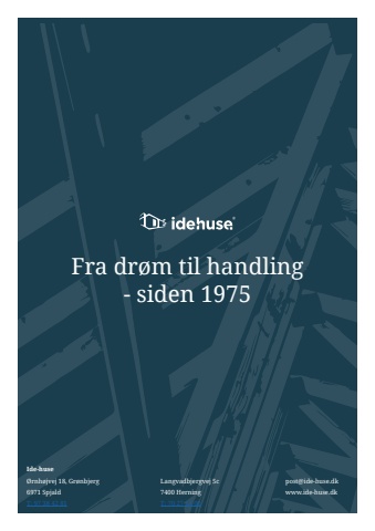 Fra dr%u00f8m til handling- siden 1975Ide-huse%u00d8rnh%u00f8jvej 18, Gr%u00f8nbjerg 6971 SpjaldT: 97 38 42 81Langvadbjergvej 5c 7400 HerningT: 70 27 18 00post@ide-huse.dk www.ide-huse.dk