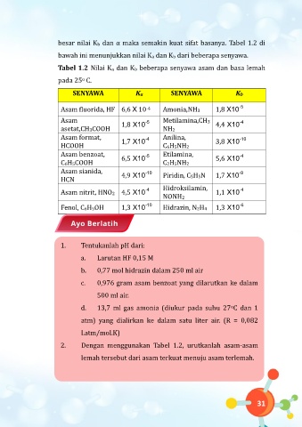 Tabel 1.2 Nilai Ka dan Kb beberapa senyawa asam dan basa lemah