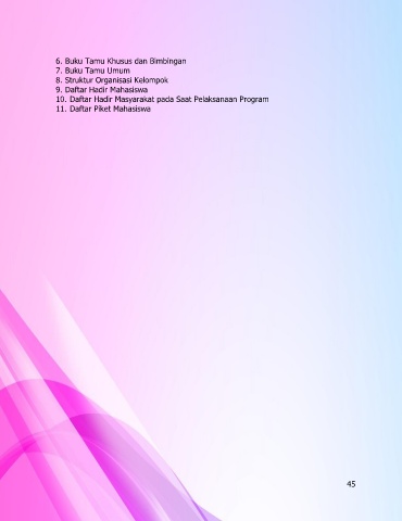 6. Buku Tamu Khusus dan Bimbingan 7. Buku Tamu Umum 8. Struktur Organisasi Kelompok 9. Daftar Hadir Mahasiswa 10. Daftar Hadir Masyarakat pada Saat Pelaksanaan Program 11. Daftar Piket Mahasiswa 45