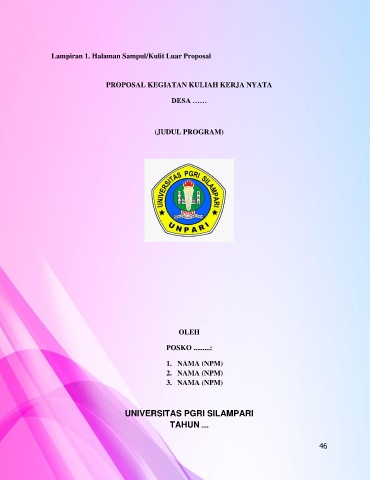 Lampiran 1. Halaman Sampul/Kulit Luar Proposal PROPOSAL KEGIATAN KULIAH KERJA NYATA DESA …… (JUDUL PROGRAM) OLEH POSKO .........: 1. NAMA (NPM) 2. NAMA (NPM) 3. NAMA (NPM) UNIVERSITAS PGRI SILAMPARI TAHUN .... 46