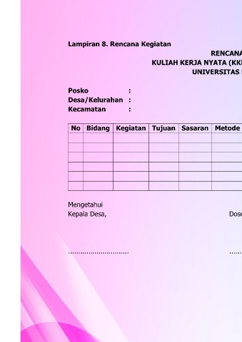No Bidang Kegiatan Tujuan Sasaran Metode Materi Tempat Waktu Pelaksana Ket