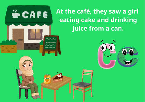 At the café, they saw a girl eating cake and drinking juice from a can.