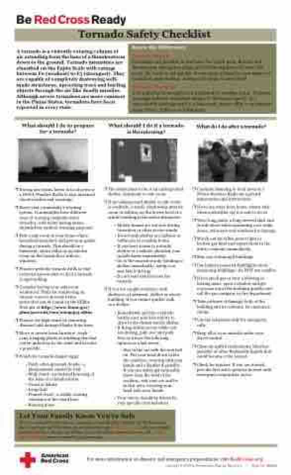 If your community experiences a tornado, or any disaster, register on the American Red Cross Safe and Well Web site available through RedCross.org to let your family and friends know about your welfare. If you don’t have Internet access, call 1-866- GET-INFO to register yourself and your family.