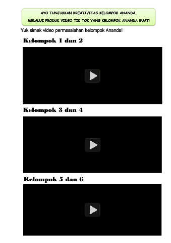 AYO TUNJUKKAN KREATIVITAS KELOMPOK ANANDA, MELALUI PRODUK VIDEO TIK TOK YANG KELOMPOK ANANDA BUAT! Yuk simak video permasalahan kelompok Ananda! Kelompok 1 dan 2 Kelompok 3 dan 4 Kelompok 5 dan 6