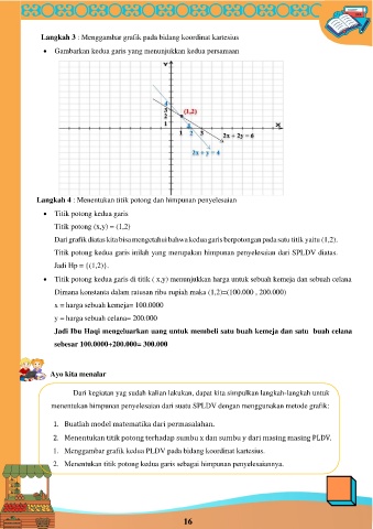 • Titik potong kedua garis di titik ( x,y) menunjukkan harga untuk sebuah kemeja dan sebuah celana
