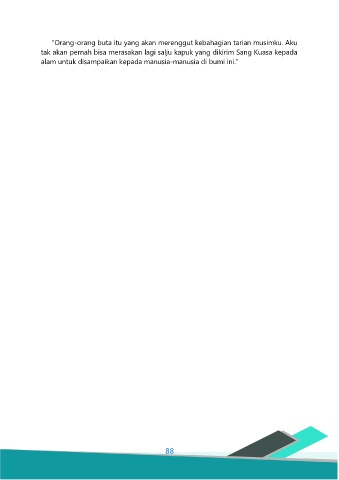 ―Orang-orang buta itu yang akan merenggut kebahagian tarian musimku. Aku tak akan pernah bisa merasakan lagi salju kapuk yang dikirim Sang Kuasa kepada alam untuk disampaikan kepada manusia-manusia di bumi ini.‖ 88