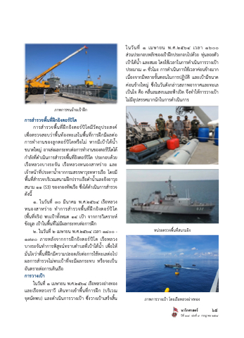ในวันที่ ๑ เมษายน พ.ศ.๒๕๖๔ เวลา ๑๖๐๐ สว่ นประกอบหลกั ของเปา้ ฝกึ ประกอบไปดว้ ย ทนุ่ ลอยตวั เป้าใต้น้า และสมอ โดยใช้เวลาในการดาเนินการวางเป้า ประมาณ ๓ ชั่วโมง การดาเนินการใช้เวลาค่อนข้างมาก เน่ืองจากมีหลายข้ันตอนในการปฏิบัติ และเป้ามีขนาด ค่อนข้างใหญ่ ซึ่งในวันดังกล่าวสภาพอากาศและทะเล เป็นใจ คือ คลื่นลมสงบและฟ้าเปิด จึงทาให้การวางเป้า ไม่มีอุปสรรคมากนักในการดาเนินการ