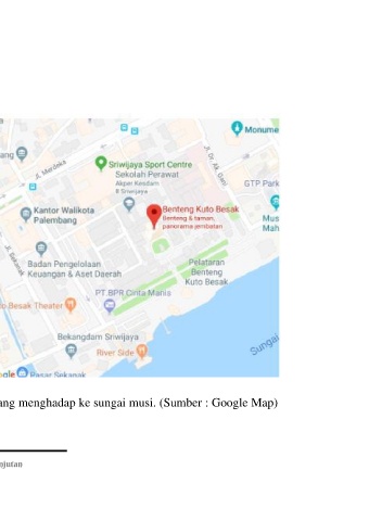 Gambar 2.21. Peta Letak Benteng Kuto Besak (BKB) yang menghadap ke sungai musi. (Sumber : Google Map)