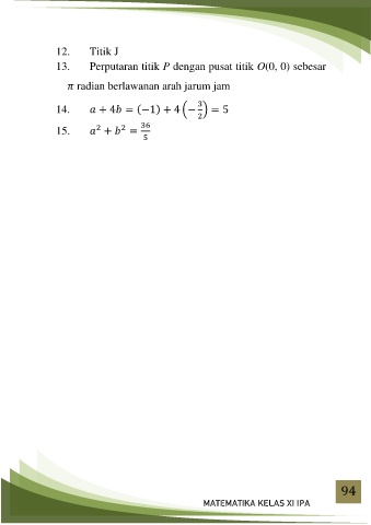 12. Titik J 13. Perputaran titik P dengan pusat titik O(0, 0) sebesar radian berlawanan arah jarum jam 14. ( ) 15. 94 MATEMATIKA KELAS XI IPA