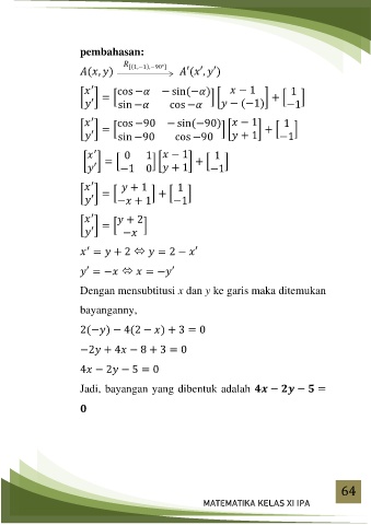 pembahasan: ′ [ ] [ ] [ ] [ ] ′ [ ] [ ] [ ] [ ] ′ [ ] [ ] [ ] [ ] ′ [ ] [ ] [ ] ′ [ ] [ ] ′ Dengan mensubtitusi x dan y ke garis maka ditemukan bayanganny, Jadi, bayangan yang dibentuk adalah 64 MATEMATIKA KELAS XI IPA
