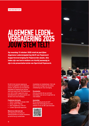 Op maandag 13 oktober 2025 vindt de jaarlijkse Algemene Ledenvergadering (ALV) van Feyenoord Supportersvereniging De Feijenoorder plaats. Alle leden zijn van harte welkom om hierbij aanwezig te zijn in de presentatieruimte van Sportclub Feyenoord.