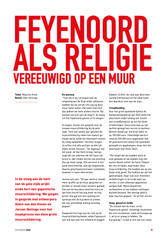 zij echter niet alle partijen op één lijn. Alwin vertelt hierover: “De eigenaar van het pand, de Van Herk Groep, had ge- zegd dat als iedereen die het huurt ak- koord is, dan vinden wij het ook prachtig. Dus ga maar langs. Eén persoon in het pand deed moeilijk, dus dat stagneerde. Daarna ging Feyenoord weer voetballen, kwamen er weer sfeeracties.”