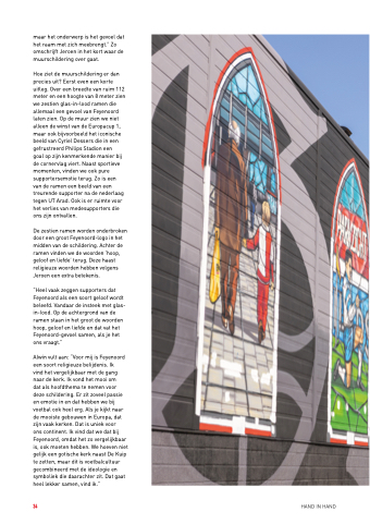 “Heel vaak zeggen supporters dat Feyenoord als een soort geloof wordt beleefd. Vandaar de insteek met glas- in-lood. Op de achtergrond van de ramen staan in het groot de woorden hoop, geloof en liefde en dat vat het Feyenoord-gevoel samen, als je het ons vraagt.”