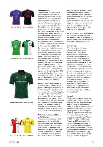bij mij op. Mijn allereerste wedstrijd van Feyenoord was meteen de kampioenswedstrijd tegen Willem II in 1984. Ook tijdens het Feyenoord Festival van 2025 beleefde ik zo’n moment. Ik stond op de tribune en zag supporters langslopen in shirts waar ik aan mee heb gewerkt aan de totstandkoming. Dat de shirts worden omarmd, maakt dit werk voor mij