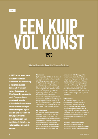 in het stadhuis is een feestelijke bijeenkomst. Om kwart over twaalf komt burgemeester Thomassen voor een korte toespraak op het balkon. Hij kondigt aan dat de gemeente Feyenoord een kunstwerk wil aanbieden, dat ergens bij het stadion moet komen. Opdat over honderd jaar nog gezegd zal worden: ‘1970? O ja, dat was het jaar waarin Feyenoord de wereldbeker won’. Pas op 28 januari 1975 wordt het kunstwerk onthuld.