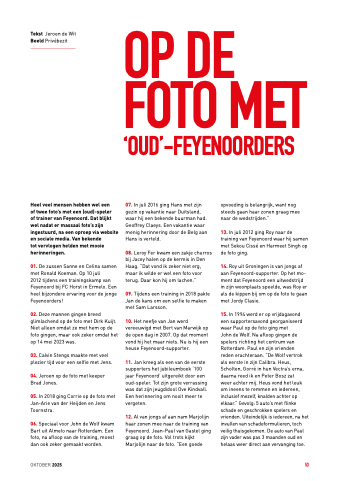 14. Roy uit Groningen is van jongs af aan Feyenoord-supporter. Op het mo- ment dat Feyenoord een uitwedstrijd in zijn woonplaats speelde, was Roy er als de kippen bij om op de foto te gaan met Jordy Clasie.