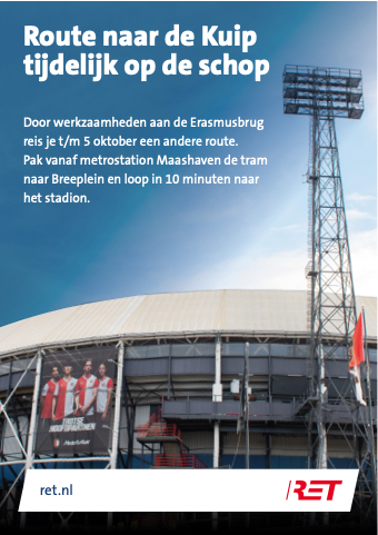 Route naar de Kuip tijdelijk op de schop Door werkzaamheden aan de Erasmusbrug reis je t/m 5 oktober een andere route. Pak vanaf metrostation Maashaven de tram naar Breeplein en loop in 10 minuten naar het stadion. ret.nl