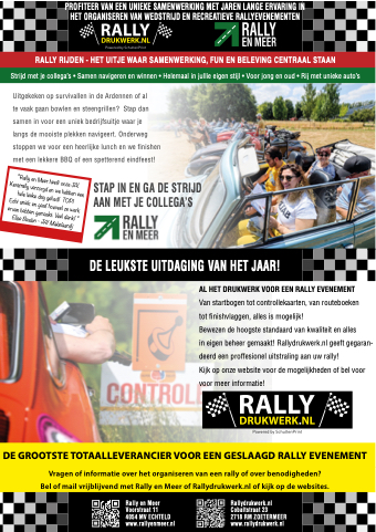 Vragen of informatie over het organiseren van een rally of over benodigheden? Bel of mail vrijblijvend met Rally en Meer of Rallydrukwerk.nl of kijk op de websites.
