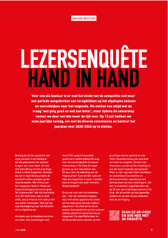 het magazine Hand in Hand van Feyenoord Supportersvereniging De Feijenoorder? We zijn benieuwd of je het blad leest, wat je leuk vindt, wat je mist en hoe vaak je het zou willen ontvangen. Ook zijn we erg nieuwsgierig naar de behoefte om te digitaliseren.
